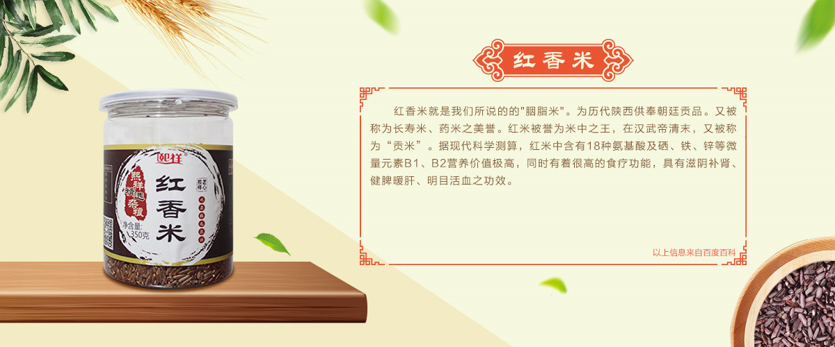 紅香米就是我們所說(shuō)的的"胭脂米"。為歷代陜西供奉朝廷貢品。又被稱為長(zhǎng)壽米、藥米之美譽(yù)。紅米被譽(yù)為米中之王,在漢武帝清末,又被稱為“貢米”。據(jù)現(xiàn)代科學(xué)測(cè)算,紅米中含有18種氨基酸及硒、鐵、鋅等微量元素B1、B2營(yíng)養(yǎng)價(jià)值極高,同時(shí)有著很高的食療功能,具有滋陰補(bǔ)腎、健脾暖肝、明目活血之功效。(以上信息來(lái)自百度百科)