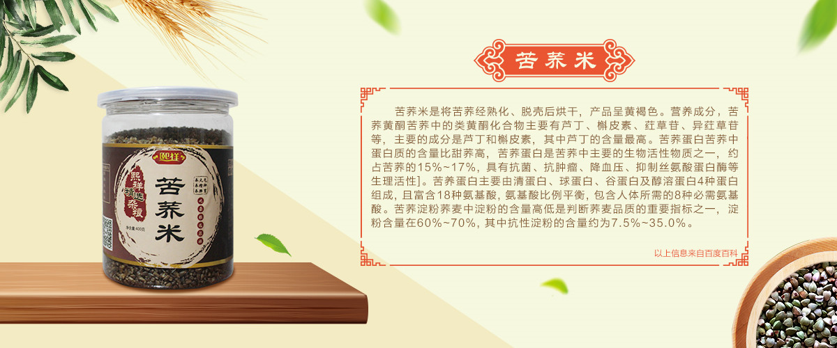 苦蕎米是將苦蕎經(jīng)熟化、脫殼后烘干, 產(chǎn)品呈黃褐色。營養(yǎng)成分,苦蕎黃酮苦蕎中的類黃酮化合物主要有蘆丁、槲皮素、葒草苷、異葒草苷等, 主要的成分是蘆丁和槲皮素, 其中蘆丁的含量最高。苦蕎蛋白苦蕎中蛋白質(zhì)的含量比甜蕎高, 苦蕎蛋白是苦蕎中主要的生物活性物質(zhì)之一, 約占苦蕎的15%~17%, 具有抗菌、抗腫瘤、降血壓、抑制絲氨酸蛋白酶等生理活性]??囵B(yǎng)蛋白主要由清蛋白、球蛋白、谷蛋白及醇溶蛋白4種蛋白組成, 且富含18種氨基酸, 氨基酸比例平衡, 包含人體所需的8種必需氨基酸。苦蕎淀粉蕎麥中淀粉的含量高低是判斷蕎麥品質(zhì)的重要指標之一, 淀粉含量在60%~70%, 其中抗性淀粉的含量約為7.5%~35.0%。(以上信息來自百度百科)