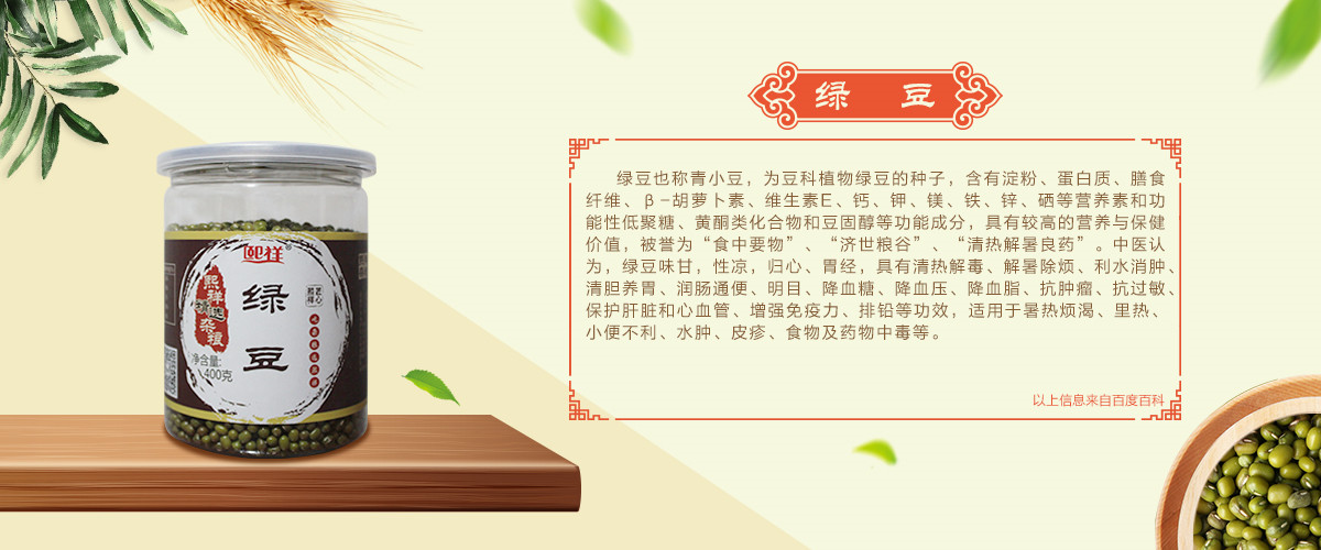 綠豆也稱(chēng)青小豆,為豆科植物綠豆的種子,含有淀粉、蛋白質(zhì)、膳食纖維、β-胡蘿卜素、維生素E、鈣、鉀、鎂、鐵、鋅、硒等營(yíng)養(yǎng)素和功能性低聚糖、黃酮類(lèi)化合物和豆固醇等功能成分,具有較高的營(yíng)養(yǎng)與保健價(jià)值,被譽(yù)為“食中要物”、“濟(jì)世糧谷”、“清熱解暑良藥”。中醫(yī)認(rèn)為,綠豆味甘,性涼,歸心、胃經(jīng),具有清熱解毒、解暑除煩、利水消腫、清膽?zhàn)B胃、潤(rùn)腸通便、明目、降血糖、降血壓、降血脂、抗腫瘤、抗過(guò)敏、保護(hù)肝臟和心血管、增強(qiáng)免疫力、排鉛等功效,適用于暑熱煩渴、里熱、小便不利、水腫、皮疹、食物及藥物中毒等。(以上信息來(lái)自百度百科)