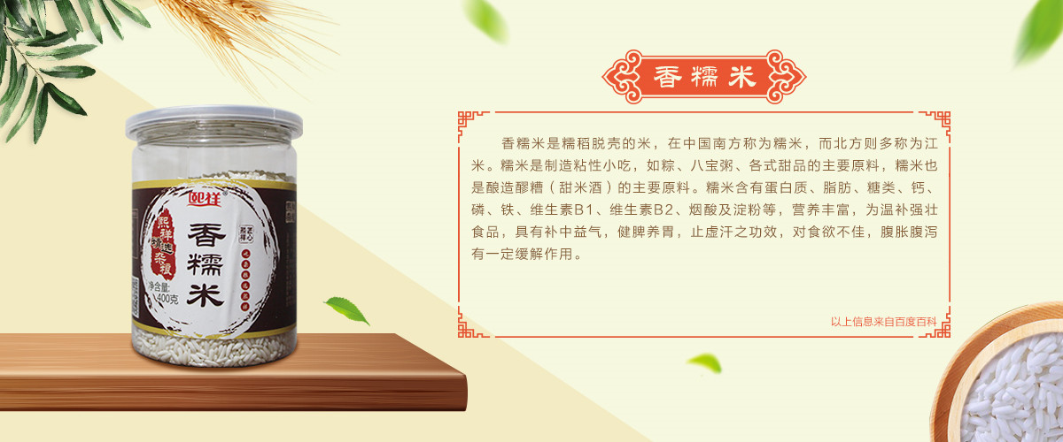 香糯米是糯稻脫殼的米,在中國南方稱為糯米,而北方則多稱為江米。糯米是制造粘性小吃,如粽、八寶粥、各式甜品的主要原料,糯米也是釀造醪糟(甜米酒)的主要原料。糯米含有蛋白質(zhì)、脂肪、糖類、鈣、磷、鐵、維生素B1、維生素B2、煙酸及淀粉等,營養(yǎng)豐富,為溫補強壯食品,具有補中益氣,健脾養(yǎng)胃,止虛汗之功效,對食欲不佳,腹脹腹瀉有一定緩解作用(以上信息來自百度百科)