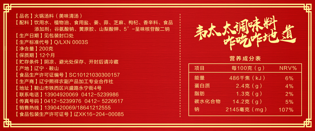 • 配料:飲用水、植物油、食用鹽、姜、蒜、芝麻、枸杞、香辛料、食品添加劑(谷氨酸鈉、黃原膠、山梨酸鉀、5-呈味核苷酸二鈉)
