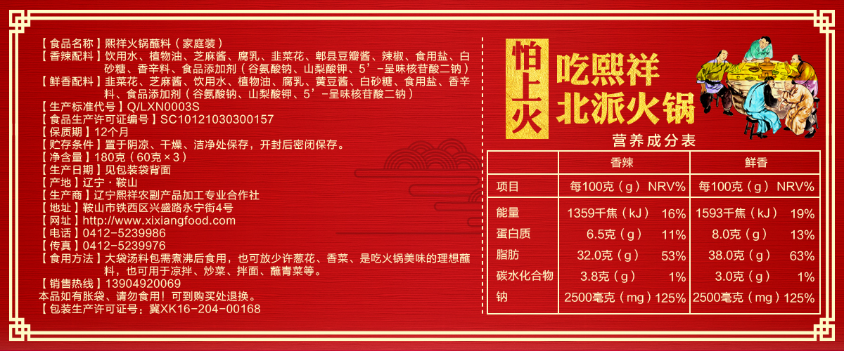 飲用水、植物油、芝麻醬、腐乳、韭菜花、郫縣豆瓣、辣椒、食用鹽、白砂糖、香辛料、食品添加劑(谷氨酸鈉、山梨酸鉀、5-呈味核苷酸二鈉) 鮮香配料:韭菜花、芝麻醬、飲用水、植物油、腐乳、黃豆醬、白砂糖、食用鹽、香辛料、食品添加劑(谷氨酸鈉、山梨酸鉀、5-呈味核苷酸二鈉)