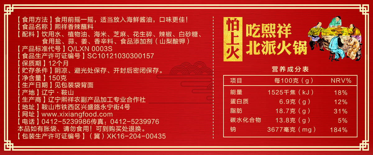飲用水、植物油、海米、芝麻、花生碎、辣椒、白砂糖、食用鹽、蒜、姜、香辛料、食品添加劑(山梨酸鉀)